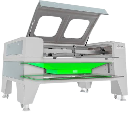 Среднеформатные станки с рабочим полем от 600х900 мм до 1600х1000 мм — самый распространенный формат станков. Они используются на производствах разных масштабов. Например, у Wattsan есть станки габаритами 1600x1000 мм, работающие с материалом неограниченной длины. Станок имеет выдвижную переднюю стенку, которая освобождает пространство для сквозной резки.
