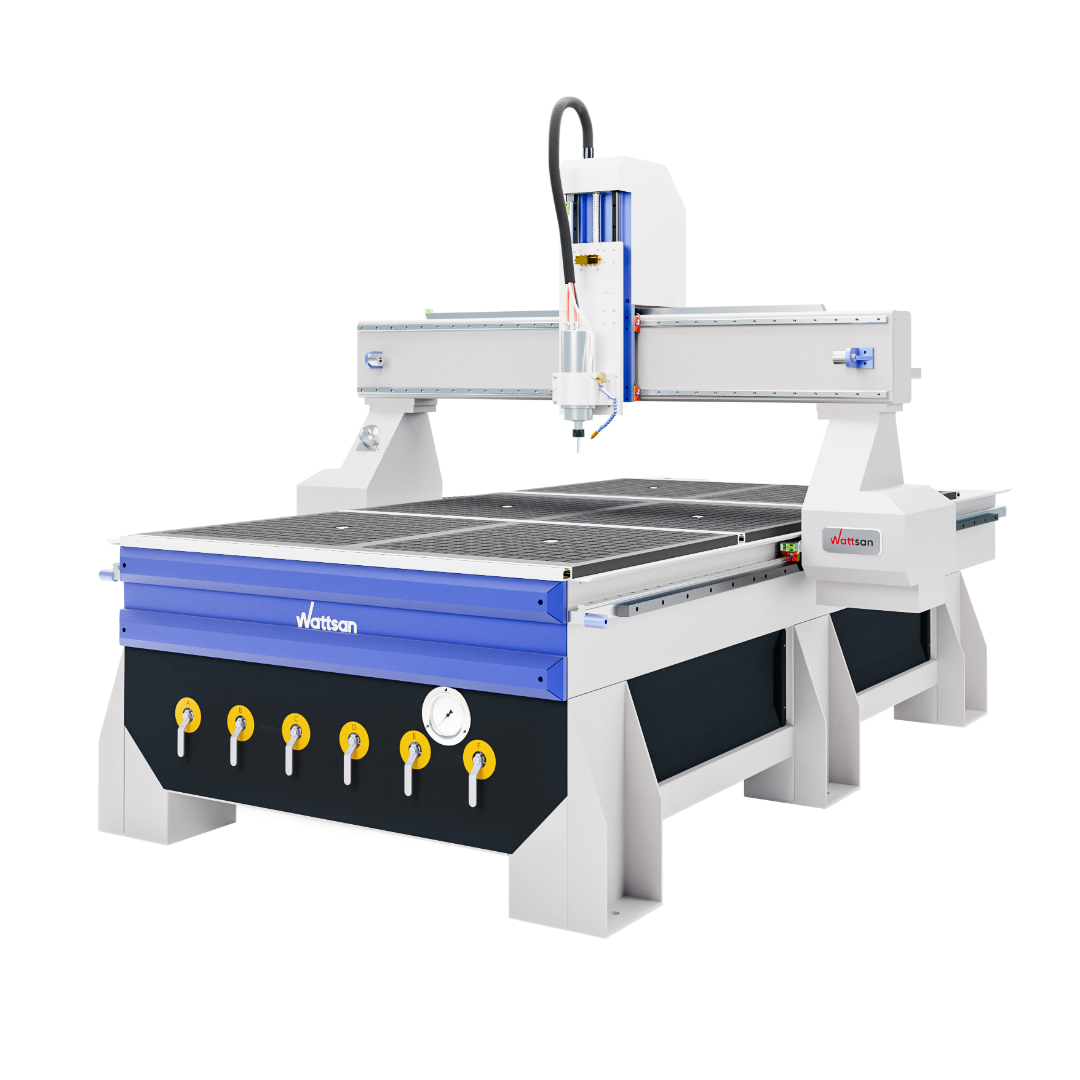 Например, Wattsan M2S 1325 оснащён вакуумным столом, системой аспирации и подачи смазки, поворотным устройством и системой СОЖ. Он подойдёт как для 3D фрезеровки, так и гравировки и резки дерева, оргстекла, ПВХ, алюминия, а также обработки плит из гранита и мрамора.