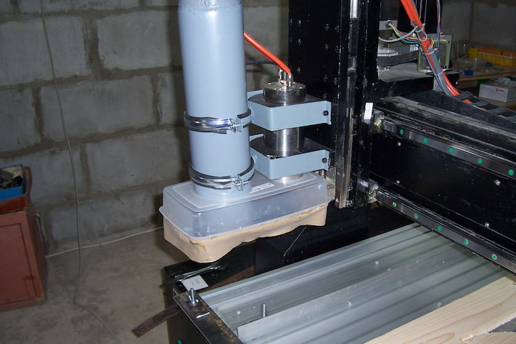 Она похожа на большой мешок, который при помощи гофры, присоединяется к шпинделю. Гофра ограждена специальной щёткой, защищающей от стружки. Так же, рядом со станком стоит отдельный мешок, который всасывает пыль.