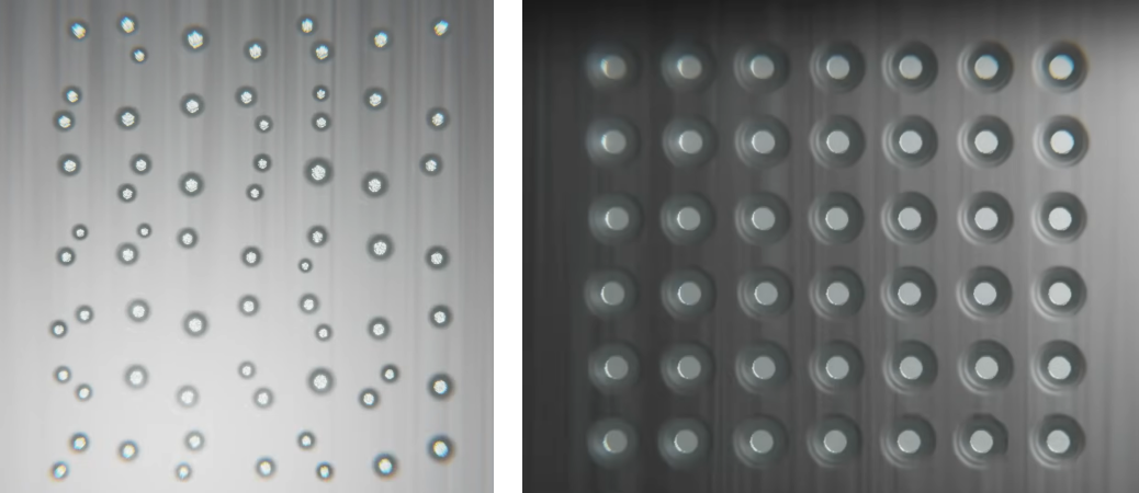 На микроскопическом уровне различие выглядит следующим образом (слева Q-Switch, справа MOPA):