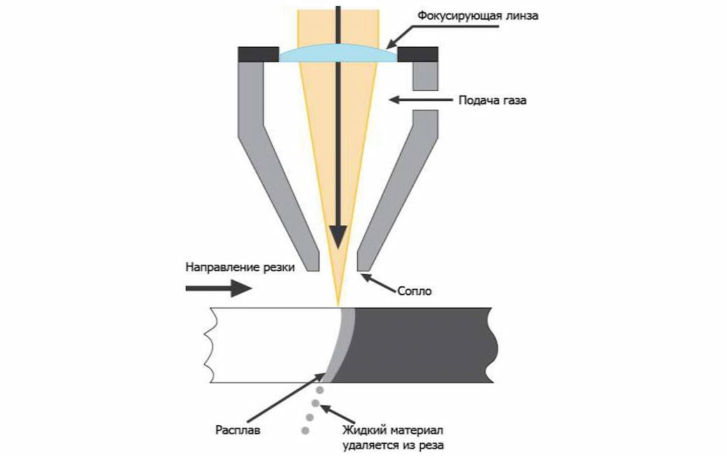 В случае с лазерной резкой плазменной резкой плавление металла происходит за счёт сфокусированного лазерного луча.