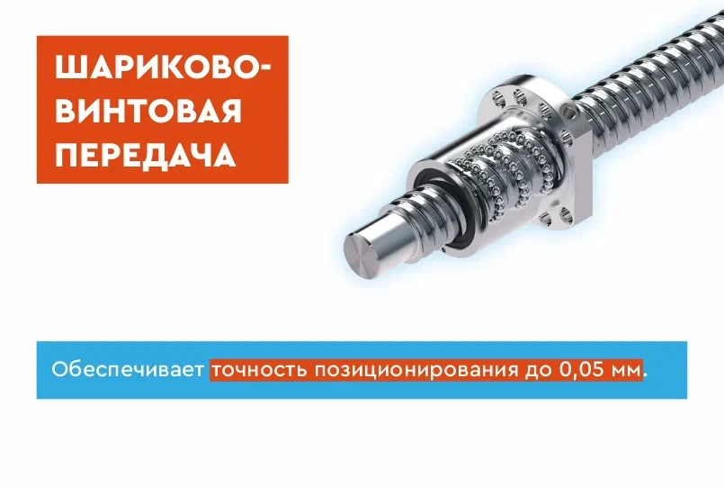 По оси Z реализована шарико-винтовая передача с запасом по ширине и жесткости, что позволяет модифицировать мощность шпинделя.