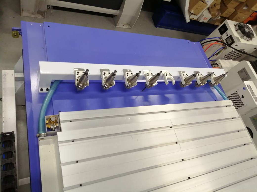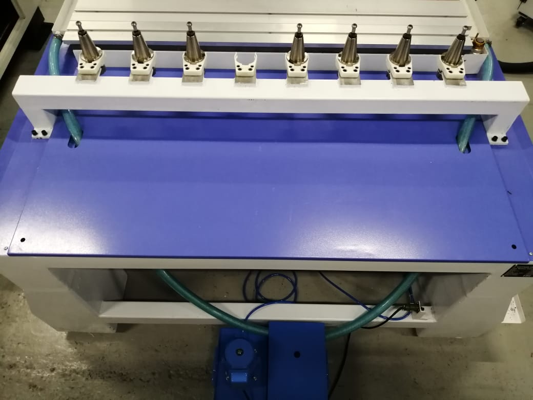 Оснащен анти-вибрационным столом и мощным шпинделем с автосменой на пневматике на 8 инструментов.