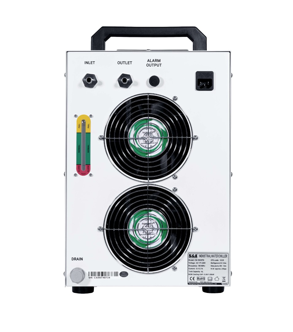 Чиллер S&A CW 5000TI относится к категории профессионального оборудования для охлаждения газовых трубок лазерно-гравировальных станков. Модель рекомендована для замещения встроенной охлаждающей системы, размещенной внутри излучателя. Подсоединение чиллера гарантирует более быстрое понижение температуры активной газовой смеси и стабильное поддержание ее на заданном уровне.