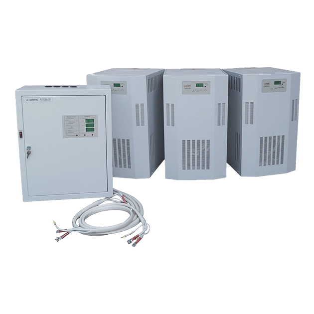 Стабилизатор напряжения состоит из трех напольных однофазных силовых блоков, настенного блока коммутации и комплекта кабелей для соединения всех блоков между собой.