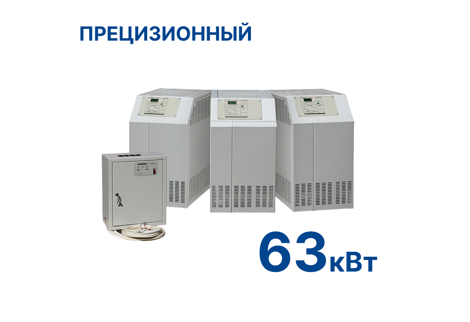 Стабилизатор напряжения состоит из трех напольных однофазных силовых блоков, настенного блока коммутации и комплекта кабелей для соединения всех блоков между собой.