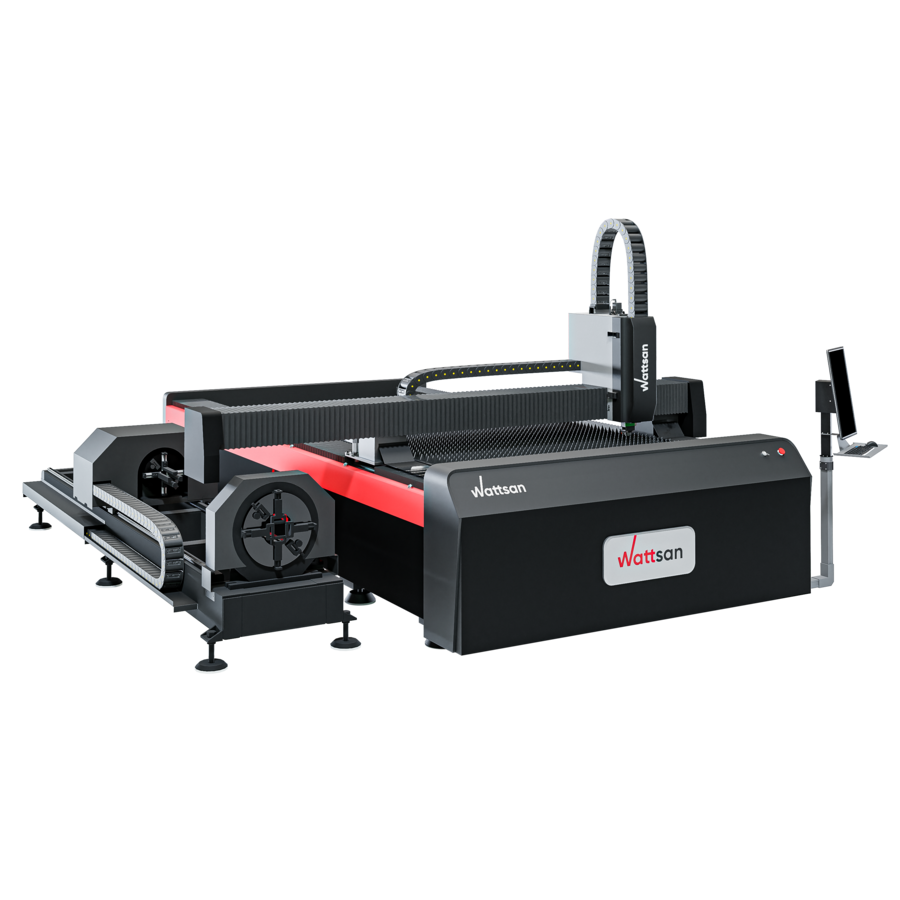 Лазерный станок Wattsan 1530S ROTATORY — металлорез 2 в 1: резка листового металла и труб. На одной платформе объединены труборезный модуль для обработки квадратных (от 10 до 140 мм) и круглых труб ( от 10 до 220 мм ), а также стол для резки листа 1500 на 3000 мм.
