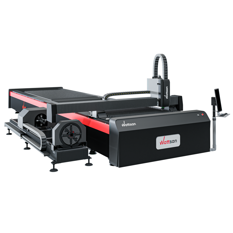 Лазерный станок Wattsan 1530S ROTATORY TABLECHANGE — металлорез 2 в 1: резка листового металла и труб. На одной платформе объединены труборезный модуль для обработки квадратных (от 10 до 140 мм) и круглых труб ( от 10 до 220 мм ), а также стол для резки листа 1500 на 3000 мм.