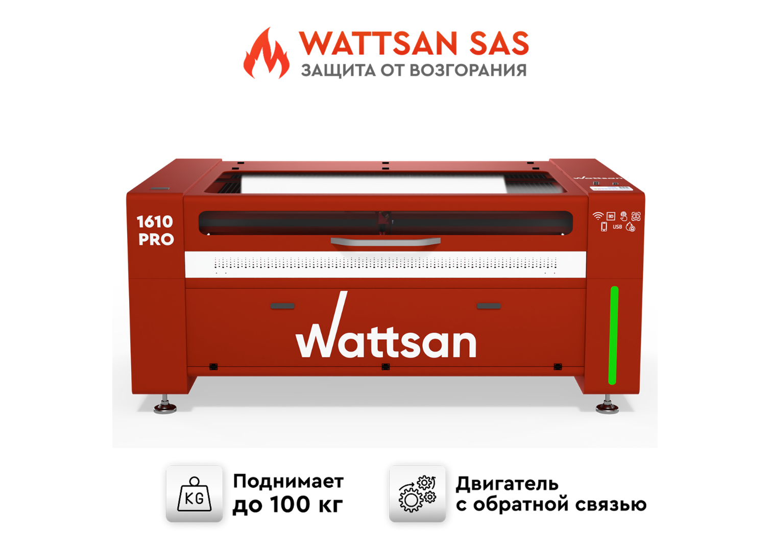 Wattsan 1610 PRO — ультраточный CO2-станок нового поколения с  для резки и гравировки с рабочим полем 1600×1000 мм. Легко справляется с самыми сложными задачами: от тончайшей гравировки до глубокой резки.