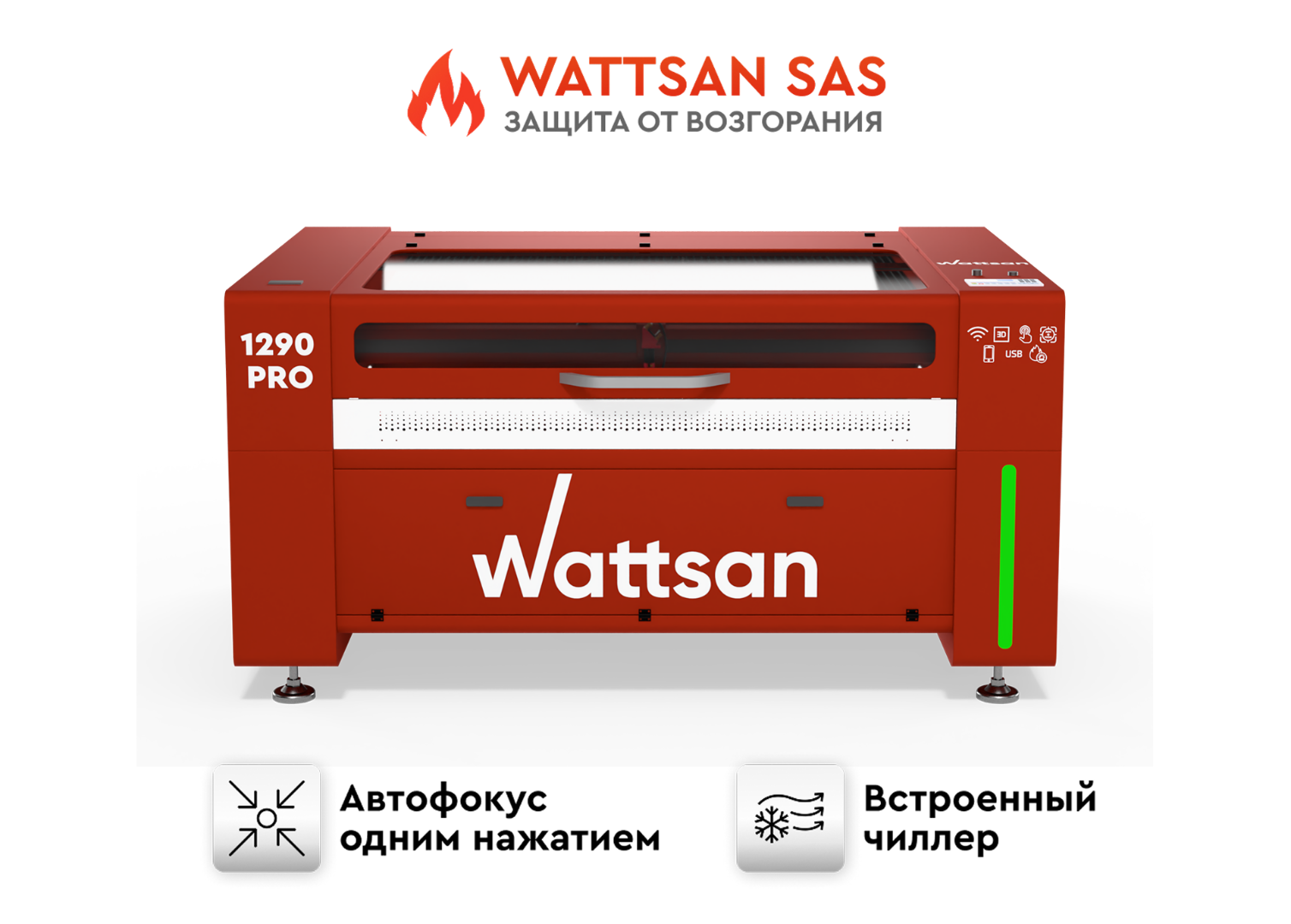 Wattsan 1290 PRO — ультраточный CO2-станок нового поколения с  для резки и гравировки с рабочим полем 1200×900 мм. Легко справляется с самыми сложными задачами: от тончайшей гравировки до глубокой резки.