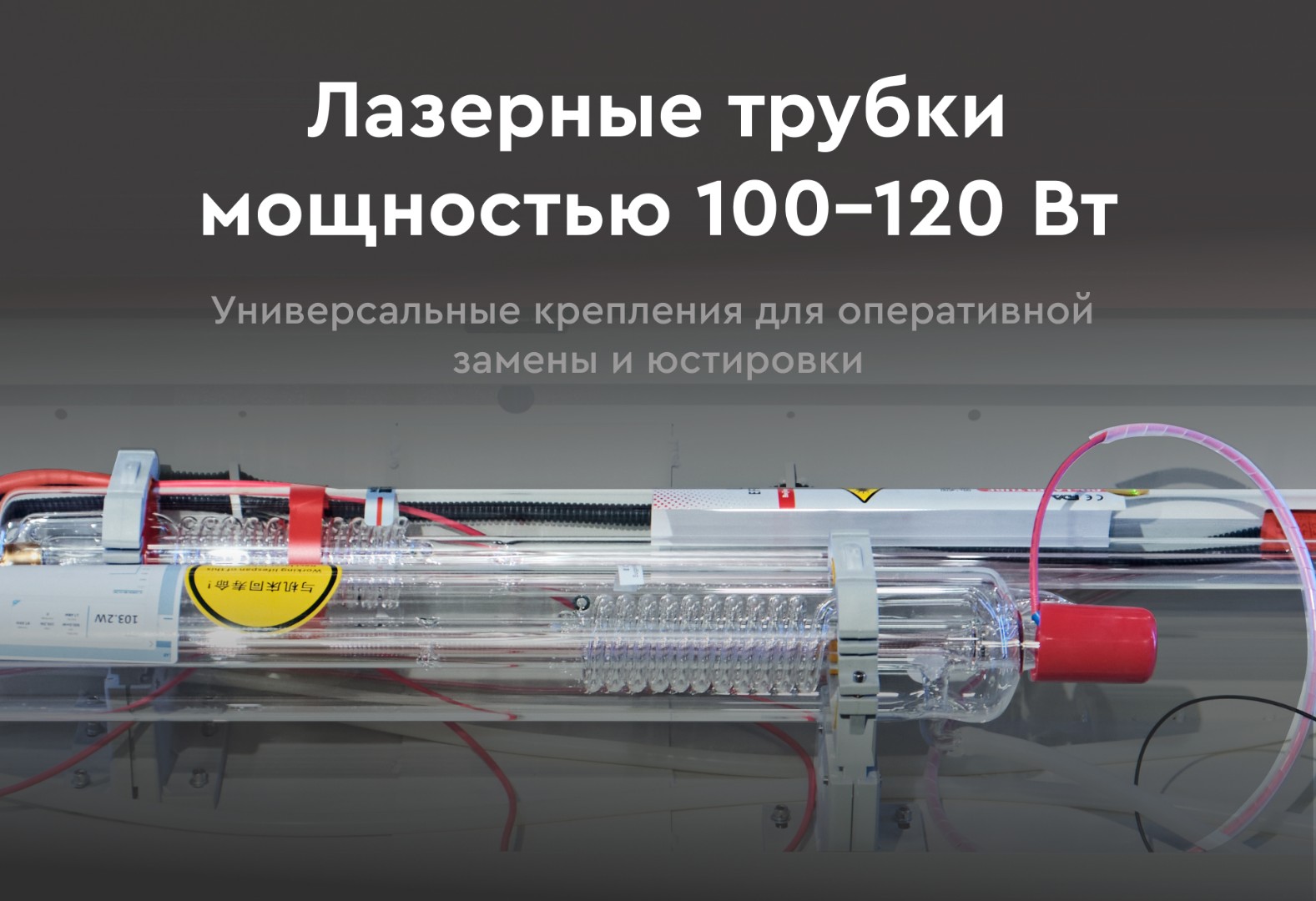 Мы установили универсальные крепления для лазерной трубки, которые оборудованы регулировочным винтом и измерительной шкалой, что позволяет производить их быструю замену вне зависимости от диаметра/мощности трубки и оперативно осуществлять юстировку станка.