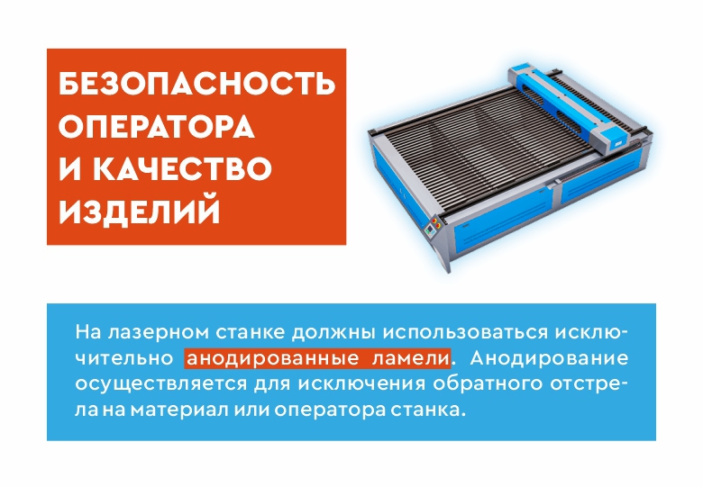 На лазерном станке должны использоваться исключительно анодированные ламели. Ламели предотвращают отстрел лазерного луча, что повышает качество обработки.