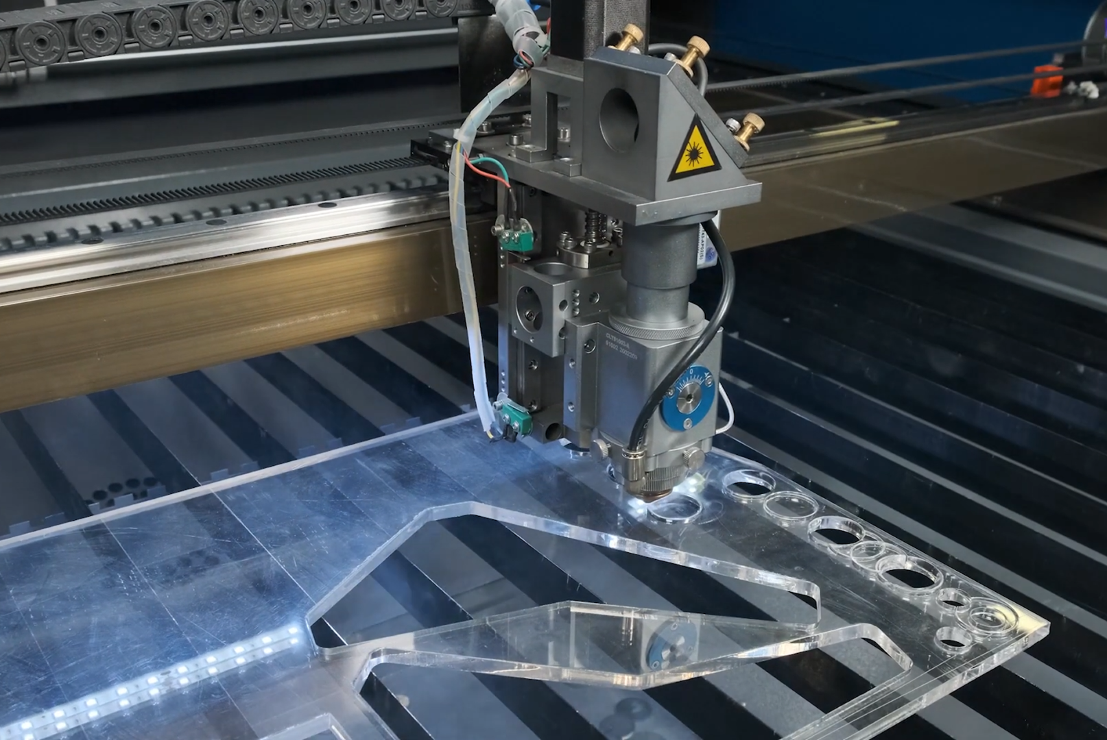 Лазерная голова имеет емкостной датчик, обеспечивающий при резке металлических материалов функцию слежения за высотой поверхности.