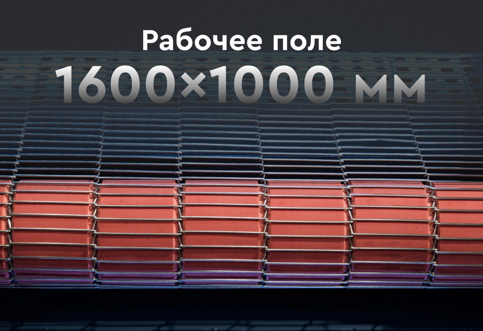 Имеет универсальный размер рабочего поля 1600х1000, так как ширина большинства рулонов не превышает 155 см.